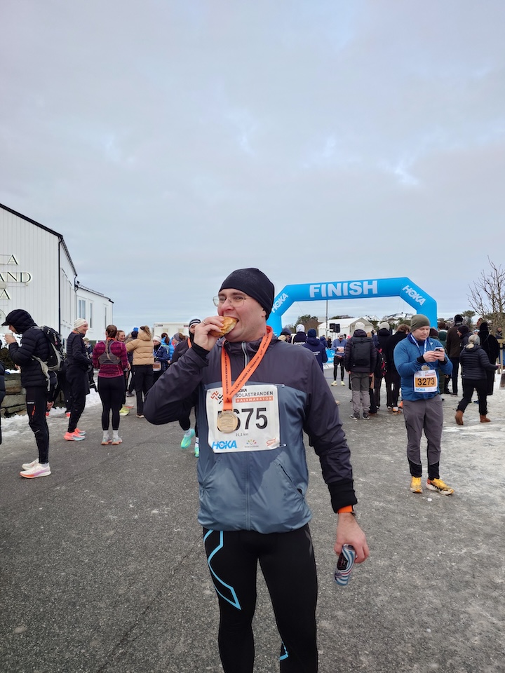It was -3° when we started running and some wind. I really regretted not wearing a buff to pull up over my face at times, especially when getting to the first drink station and drinking the nearly freezing water. I couldn't feel my lips. Guy next to me commented that he hoped for coffee on the next pit stop, which made me laugh at least. You don't really get much time to drink if you want to keep up. I started losing my group at around 11km, as people pushed up in front of me and then slacked off a bit which spread the group out, and I could feel some strain in my lower back. I pushed through and at 15km there is an up hill section where I actually managed to pass quite a few people. But after getting to the top at 16km I felt spent and didn't manage to keep my pace any longer, so people started passing me again.